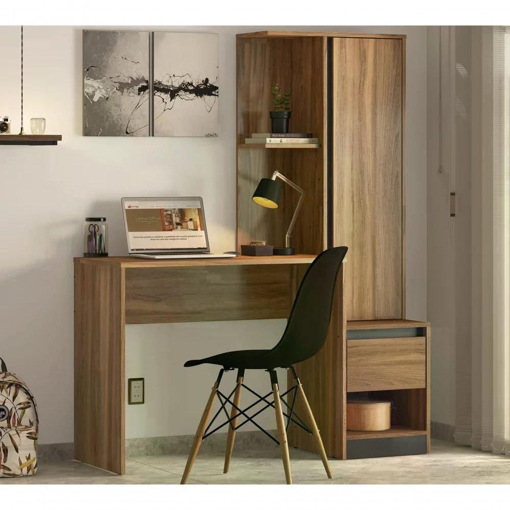 Escrivaninha Com Armário Morada, este móvel vai tornar a sua rotina de trabalho mais ágil e prática, com ótimo espaço interno, seus documentos, papéis e arquivos estarão sempre arrumados e organizados, possui estrutura em MDP de 15mm e 12mm, acabamento em pintura UV (Fosco). Possui 01 porta com dobradiças metálicas, prateleiras internas, tampo amplo com espaço ideal para dispor seu notebook, sua papelada do trabalho ou seus livros de estudo, conta com 01 gaveta com corrediças metálicas e com puxador moderno embutido, 01 nicho abaixo da gaveta garante mas espaço para seus itens. Este móvel chegará em sua casa separado em 01 volume.
