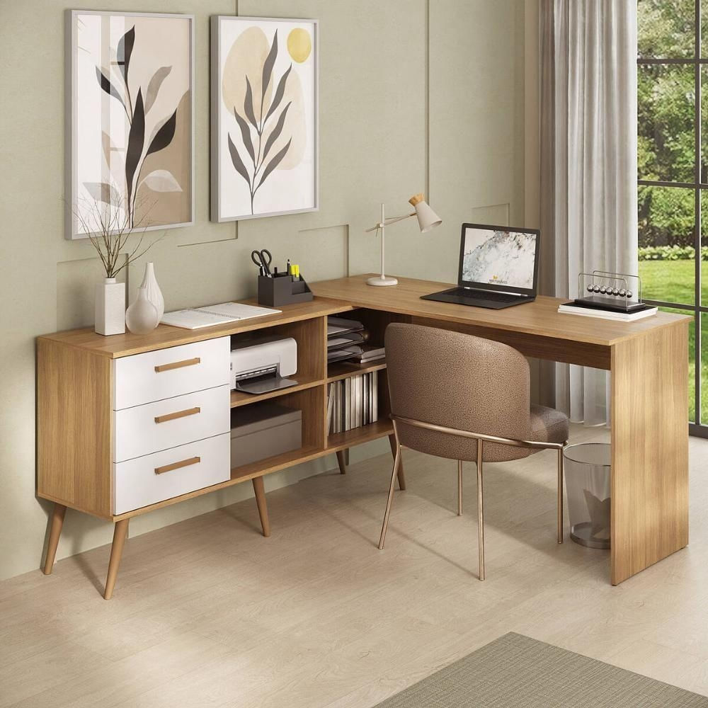 A Escrivaninha de Canto em L com 3 Gavetas Porto Multimóveis MP6036 é a escolha ideal para quem busca praticidade, organização e um visual moderno para o home office, quarto ou escritório. Versátil e funcional, ela se adapta perfeitamente ao seu espaço, oferecendo excelente aproveitamento de área e soluções inteligentes para manter tudo sempre ao alcance das mãos. Diferenciais: - Produzida em madeira de reflorestamento (MDP 15mm): garante resistência e durabilidade. - Acabamento acetinado (cerca de 20% de brilho): proporciona facilidade na limpeza e visual elegante. - 4 opções de montagem: formato reto ou em L (canto), com a mesa à esquerda ou à direita do balcão - 3 gavetas com corrediças metálicas: oferecem abertura suave e praticidade na organização dos seus itens. - 4 nichos externos ideais para livros, pastas, objetos decorativos ou materiais de trabalho/estudo. - Tampo resistente (suporta até 10kg) para acomodar seu computador. - Pés retrô em polipropileno: agregam estabilidade, charme e personalidade ao móvel. - Puxadores em ABS: resistentes e modernos.