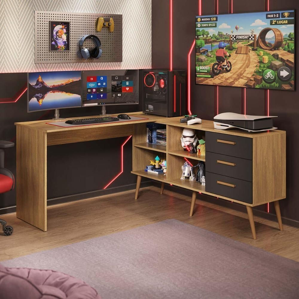 Escrivaninha Gamer Em L Para Computador 3 Gavetas Nexus Multimóveis Mp4781 Madeirado/preto
