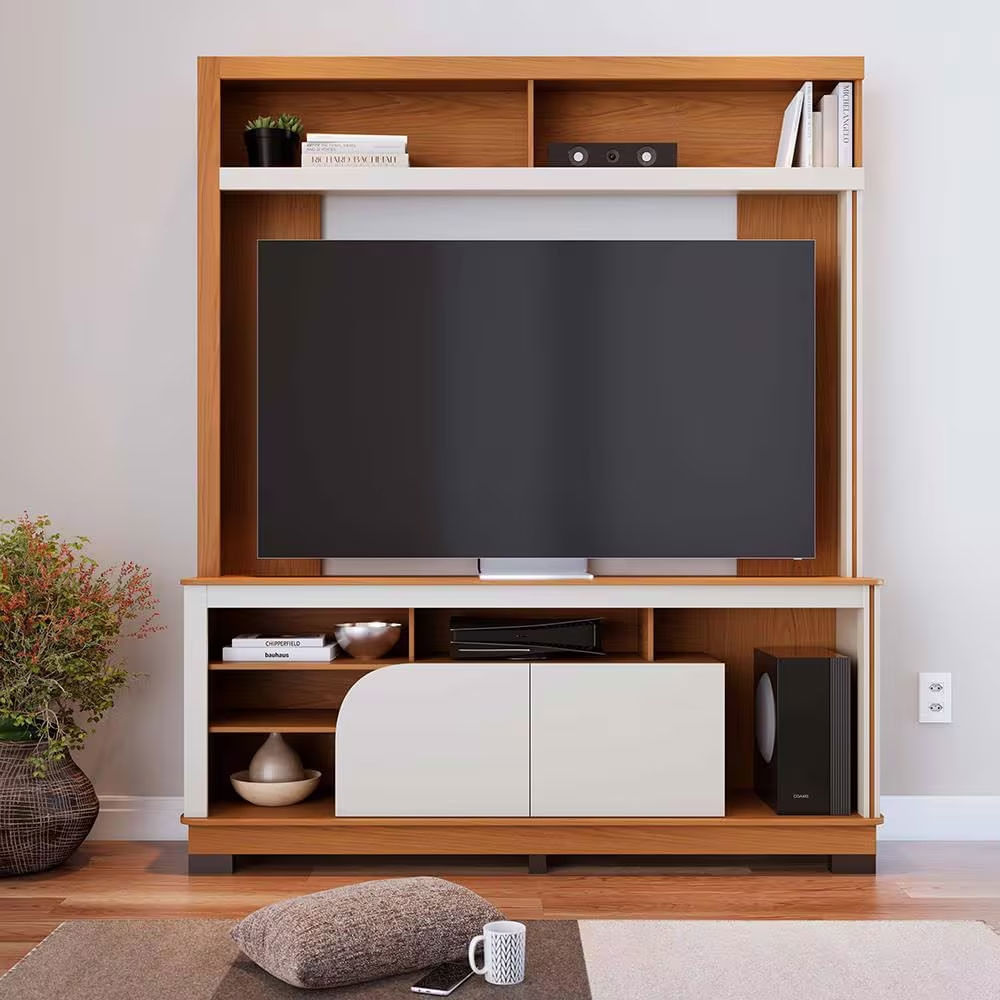 Estante para até TV 65 Belaya 2 Portas Divisórias Inteligentes Passa Fio Tampo e Base Curvos Colibri Nogueira Real com Off White
