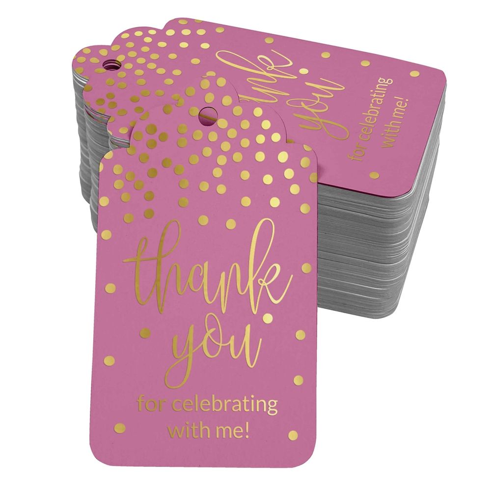 Etiquetas de Papel para Lembrancinhas de Aniversário 'Obrigado por Celebrar Comigo' com Foil Artesanal - Inkdotpot 50 Etiquetas Metalizadas / Rosa - Dourado