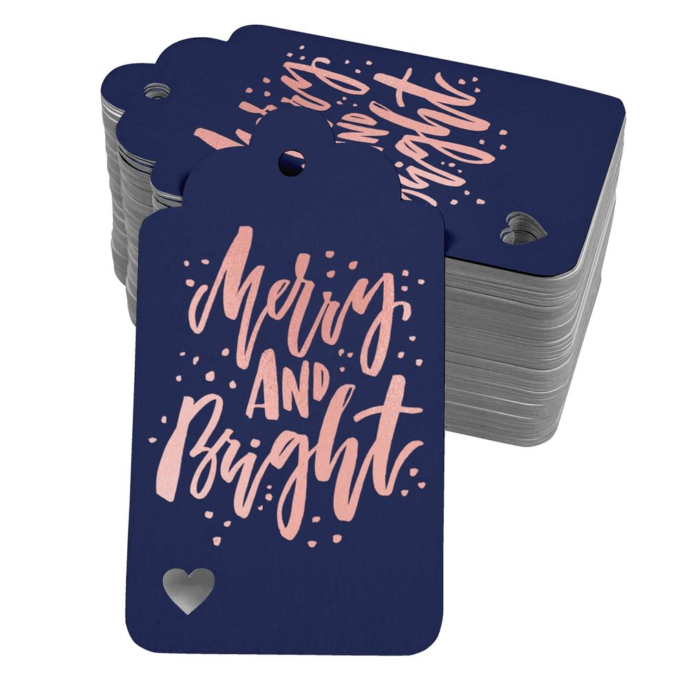 Etiquetas para Pendurar em Garrafas Natalinas Metalizadas 'Merry And Bright' para Lembrancinha - Inkdotpot 50 Etiquetas Metalizadas / Azul - Ouro Rosé