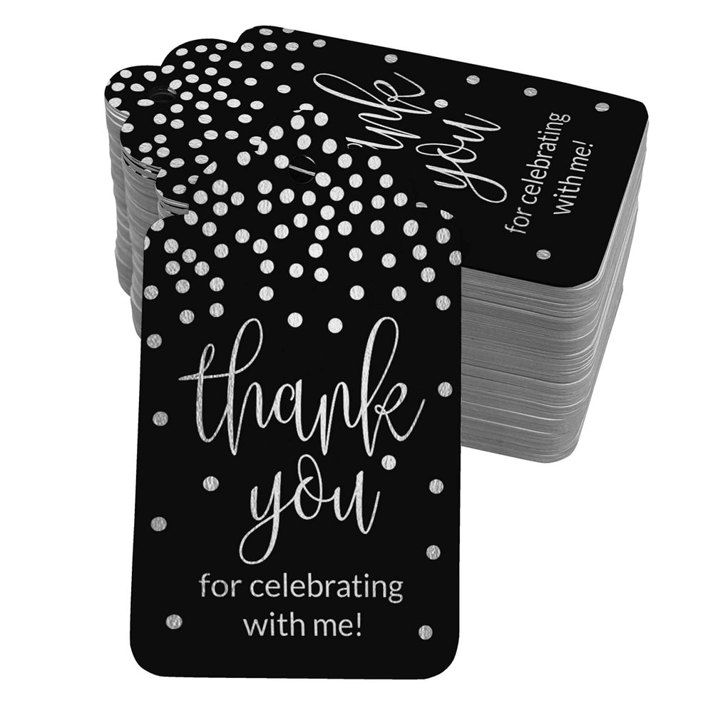 Etiquetas Penduradas em Papel Metalizado "Obrigado por Celebrar Comigo" para Lembrancinhas de Aniversário - Inkdotpot 50 Etiquetas Metalizadas / Preto - Prata