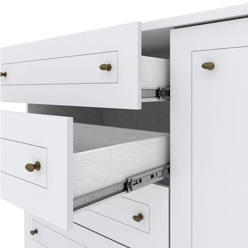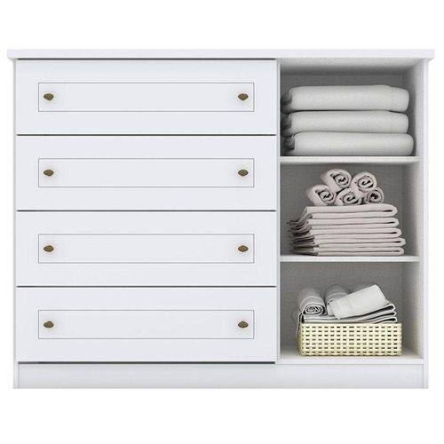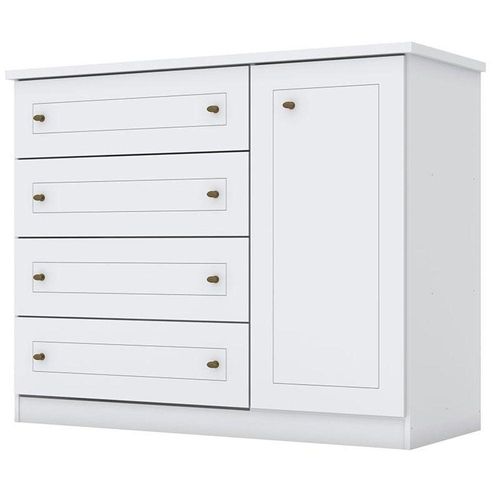 Dimensões: Altura: 218 cm Largura: 155 cm Profundidade: 49 cmCômoda Infantil Americano Branco HP – HennCaracterísticas Técnicas: - Desenvolvido em MDP/ MDF - Frentes em MDF com usinagem em baixo relevo - Pintura na cor Branco HP - Acabamento em U.V Fosco - 1 Porta - 4 Gavetas com corrediças telescópicas - Prateleiras internas - Puxadores na cor bronze - Lindo design