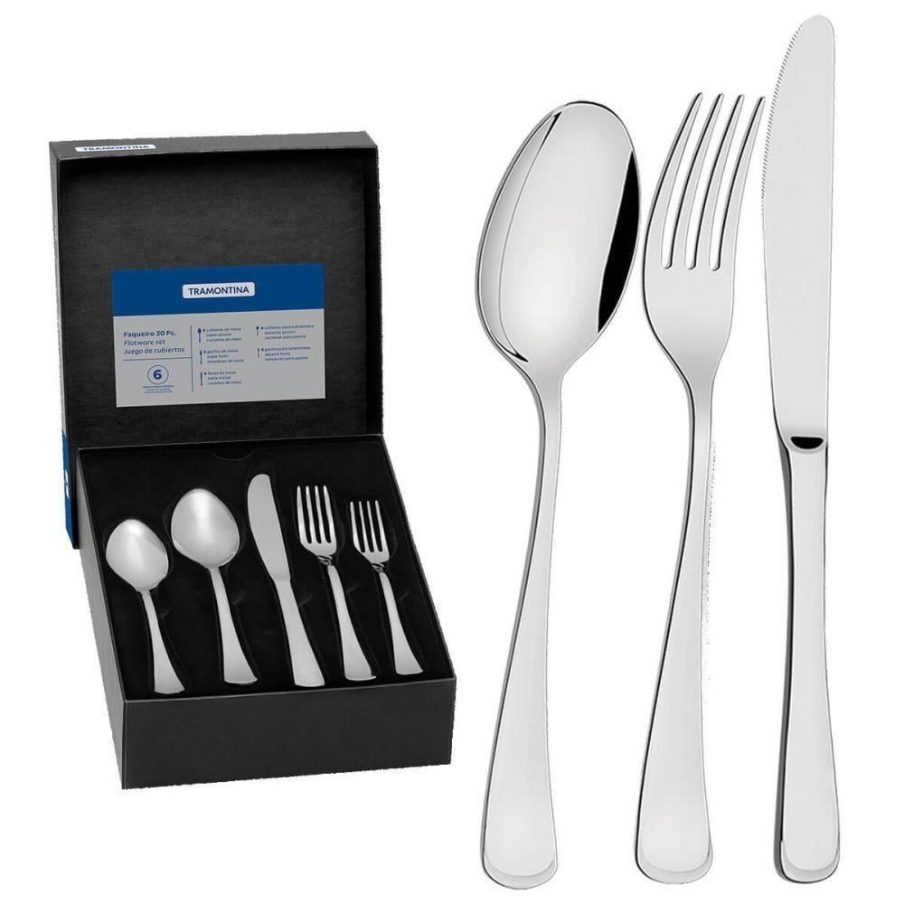 - Tenha os mais belos talheres no seu serviço de mesa com o Faqueiro Tramontina em Aço Inox com Facas de Mesa Forjadas Acabamento Brilho 30 Peças Peças da linha Mônaco.