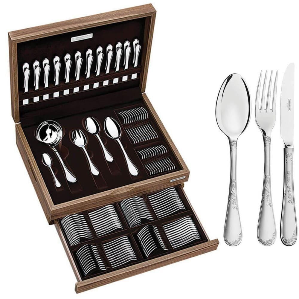 O conjunto inclui 101 peças, proporcionando um completo para sua mesa. As peças são acondicionadas em um elegante estojo de madeira, tornando-o uma excelente opção para presentear.