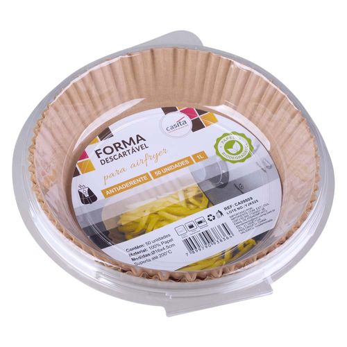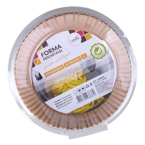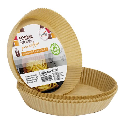 FORMA DESCARTÁVEL PARA AIRFRYER, CONTÉM 50 UNIDADES, EM 100% PAPEL, TAMANHO: 16X4,5CM - MARCA CASITA RESISTENTE VEM COM 50 POR PACOTE SUPORTA ATÉ 220°C ANTIADERENTE A FORMA TAMBÉM PODE SER USADA EM FORNO ELÉTRICO, FORNO CONVENCIONAL E MICROONDAS CUIDADOS: NUNCA LIGUE A AIRFRYER COM A FORMA VAZIA, POIS O PAPEL PODE VOAR E ENTRAR EM CONTATO COM A RESISTÊNCIA, CAUSANDO RISCO DE INCÊNCIO EVITE EXCESSO DE ÓLEO OU GORDURA, O PAPEL PODE ENCHARCAR E PERDER A RESISTÊNCIA, COMPROMETENDO A SEGURANÇA E A EFICIÊNCIA DO COZIMENTO EDIÇÃO AUTORIZADA EXCLUSIVAMENTE POR ANGELICA (IMPORTAÇÃO) OU NATHALIA (DESIGN) RÓTULO + BLISTER FEITO COM PAPEL BIODEGRADÁVEL NÃO REUTILIZE A FORMA DESCARTÁVEL, POIS ELA PODE ESTAR FRÁGIL, ENGORDURADA OU CONTAMINADA. IMPORTADOR: PAÍS DE ORIGEM: IMPORIENTE COMÉRCIO EXTERIOR LTDA CNPJ: 00 955 719/0001-86 CHINA LIMPEZA: E