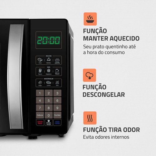 | Informações Tecnicas | Capacidade máxima21 l CorPreta Dimensões (cm)Altura: 26,2; Largura: 45,5; Profundidade: 34,8 FunçõesTira Odor, Descongelar, Manter aquecido, Menu dia a dia, Menu Kids, Função relógio Garantia do fabricante12 Iluminação InternaSim Níveis de potência10 Painel DigitalSim Potência1200 W ProgramávelSim Receitas pré-programadasSim ReferênciaMO01 Tempo de Garantia1 ano Timer DigitalSim Trava de segurançaSim VídeoVoltagem127V |