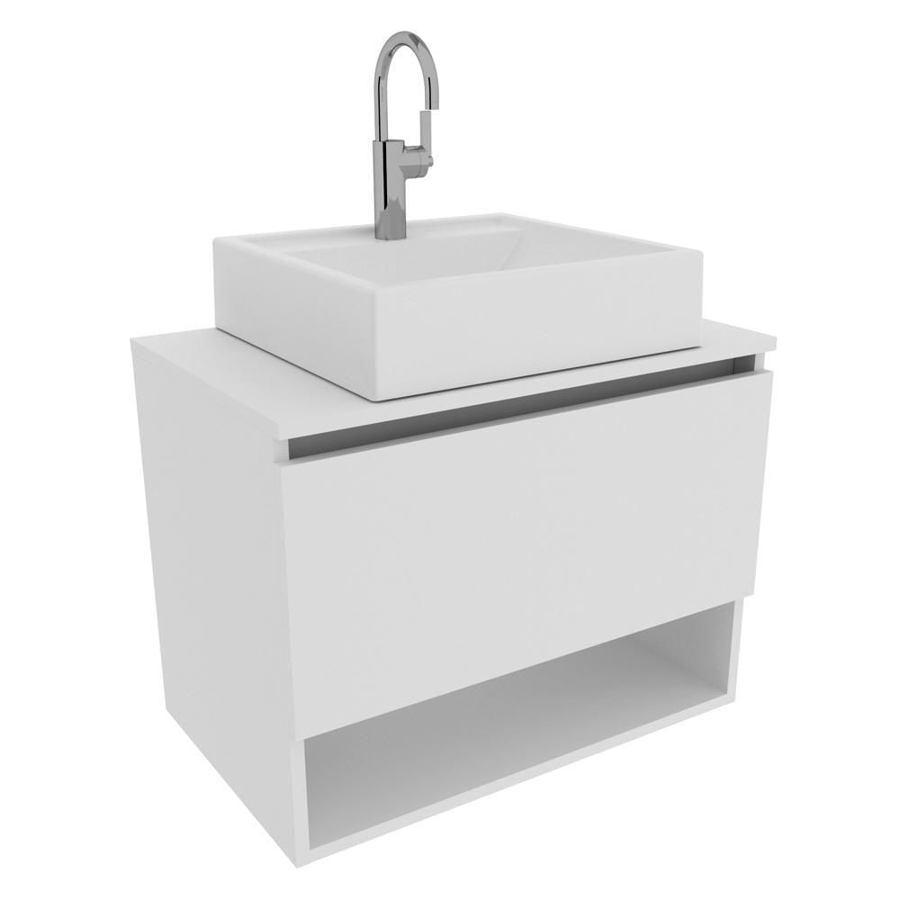 Conjunto Gabinete Suspenso Com Cuba Para Banheiro. Com design prático e funcional, o móvel entrega ao ambiente toques de modernidade e elegância. Gabinete com estrutura em MDP de 15mm, e acabamento em pintura UV/BP. Possui 01 porta basculante com dobradiças metálicas e articulador com trava, 01 nicho exposto para tornar sua rotina mais pratica. Cuba em mármore sintético e acabamento Brilho Polido, esta Cuba já vai com furação para intalação da torneira (torneira não inclusa). O mármore sintético combina alta resistência ao impacto e baixa porosidade, proporcionando maior impermeabilidade a manchas, o que garante a resistência e vitalidade do produto. Este conjunto é uma ótima escolha para manter seus produtos de higiene e beleza sempre organizados. Estes produtos chegarão na sua casa separados em 02 volumes. Dimensões Balcão Suspenso Alt 46,5 x Larg 60 x Prof 38,7 cm