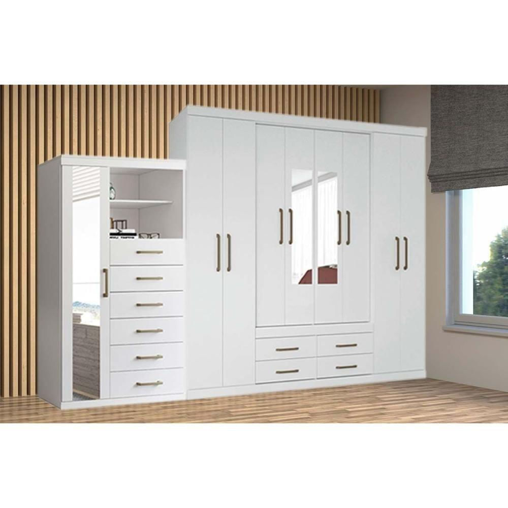 Dimensões(Cm): Comnto(Profundidade): 46,3cm x Largura: 212cm x Altura: 217,6cm Tipo de Acabamento da Pintura - Pintura Fosca Diferenciais Guarda Roupas - Calceiro Material dos Cabideiros - Cabideira Metálico Quantidade de Portas - 8 Portas de Abrir Tipo de Corrediça - c/ Corrediças Metálicas Quantidade de Gavetas - 4 Gavetas Quantidade de Prateleiras - 9 Quantidade de Nichos - 8 nichos Garantia - 3 meses