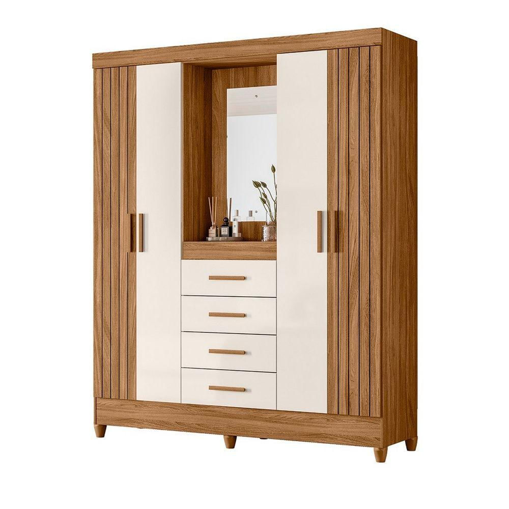 Guarda Roupa Atenas Quarto Casal 4 Portas 4 Gavetas Espelho Freijo Com Off White