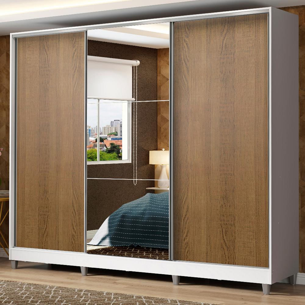 Guarda Roupa Casal 100% MDF Madesa Zurique 3 Portas de Correr com Espelho com Pés - Branco/Rustic Branco/Rustic