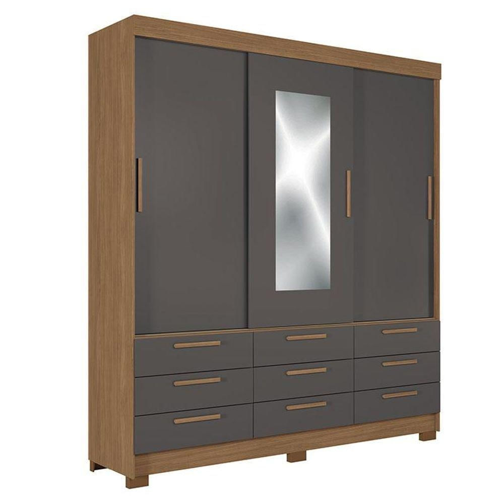 Guarda Roupa Casal 3 Portas De Correr 9 Gavetas Morretes Com Espelho Jatobá Grafite - Santos Andirá