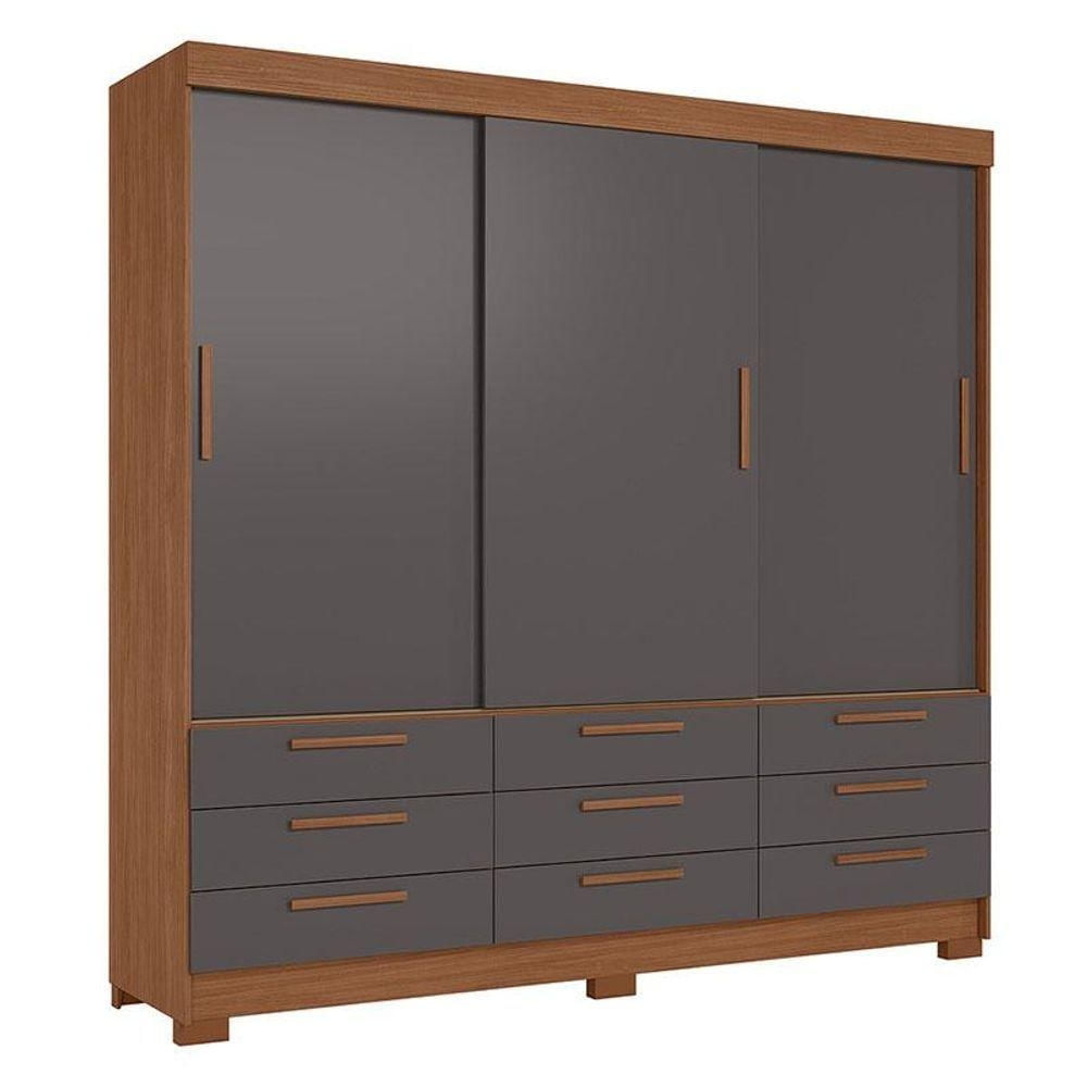 Guarda Roupa Casal 3 portas de correr 9 gavetas Morretes Jatobá Grafite - Santos Andirá Guarda Roupa Casal 3 portas de correr 9 gavetas Morretes Jatobá Grafite: Quer muito espaço em um guarda-roupa compacto? O Morretes 3.9 traz nove gavetas e prateleiras internas para organizar a casa inteira, além de portas que deslizam com freios. Uma solução elegante e muito funcional.Características técnicas: - Desenvolvida em MDP - Pintura em Verniz Fosco - 09 Gavetas externas com corrediças telescópicas - Puxadores em MDF revestidos - 02 Cabideiros/calceiros em aluminio - Pés em PVC - 04 Amplas prateleiras - Amplo maleiro - Portas de correr com trilho metálico