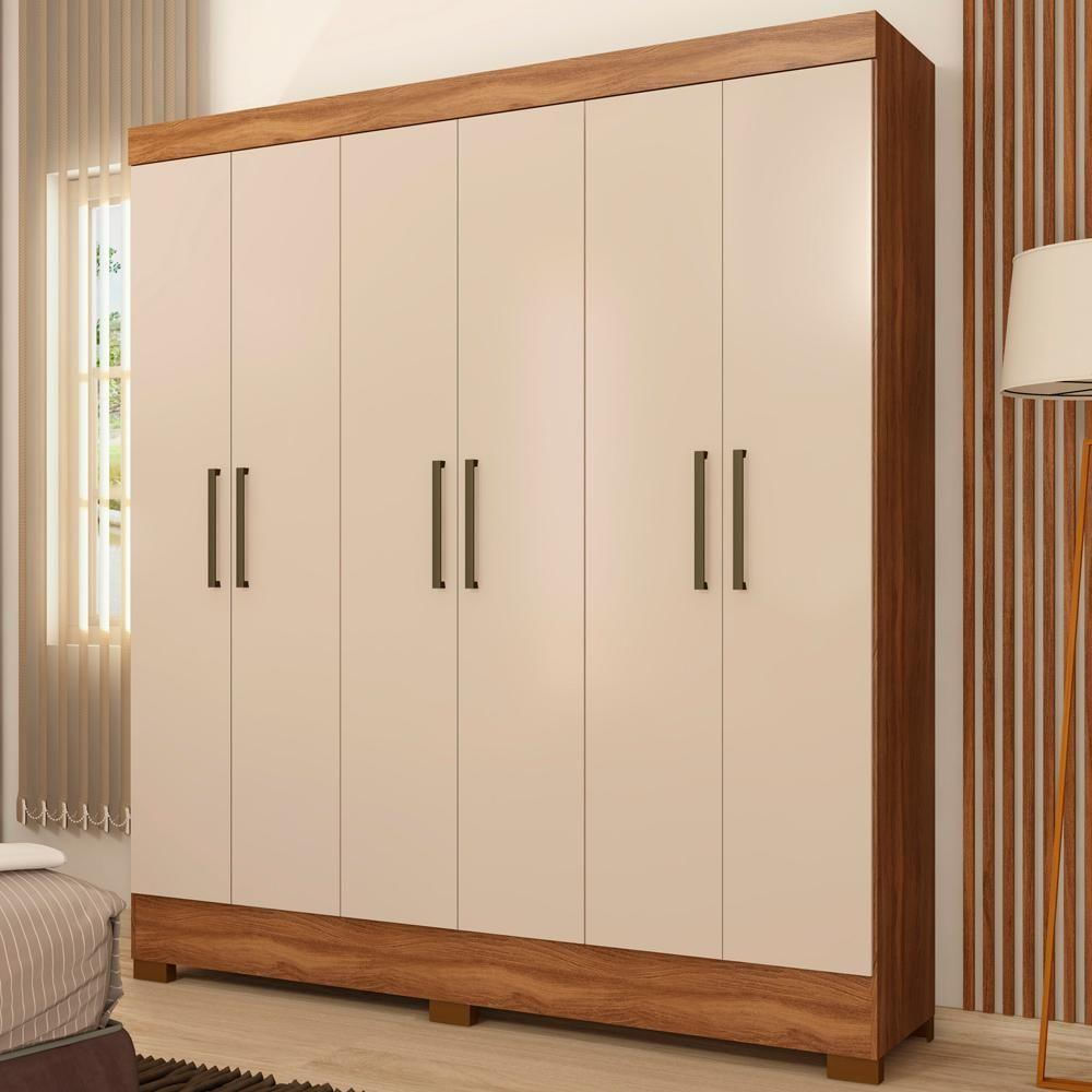 prateleiras, estrutura em MDP de alto padrão com 12mm, acabamento em pintura UV. Composto por 6 portas articuladas com dobradiças metálicas, 2 gavetas com corrediças metálicas com deslize perfeito, conta com 3 cabideiros oblongos em alumínio para roupas longas, praleiras com amplo espaço interno, equipado com puxadores modernos na cor bronze, possui acabamento em impressão de alta qualidade que garante maior resistência ao móvel, acompanha pés em PVC de série. Este móvel chegará em sua casa separado em 02 volumes.
