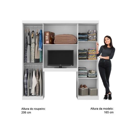 Medidas: Largura: 200 cm | Altura: 206 cm | Profundidade: 46,3 cm Espaço para a televisão: Largura: 90 cm | Altura: 59 cm | Profundidade: 44,4 cm Matéria Prima: MDP Portas: 6 portas de batente Sistema de abertura: Dobradiça 26mm Puxador: ABS Espelho: Sem espelho Cabideiro: 2 (madeira) Prateleiras: 5 (6 nichos) Montagem: Minifix e Parafuso Detalhe Externo: Montagem Flexível