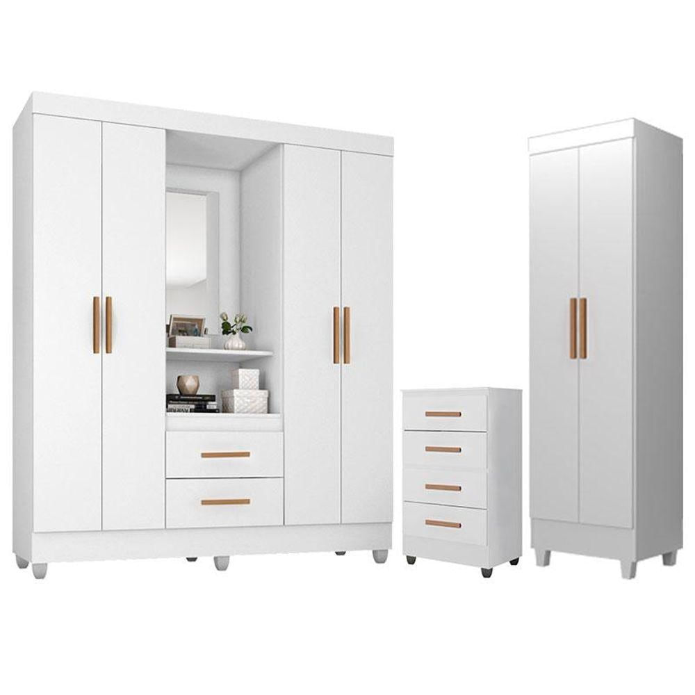 Guarda Roupa Casal Capela Com Cômoda 4 Gavetas E Armário Multiuso Lite Branco Brilho - Móveis Leão