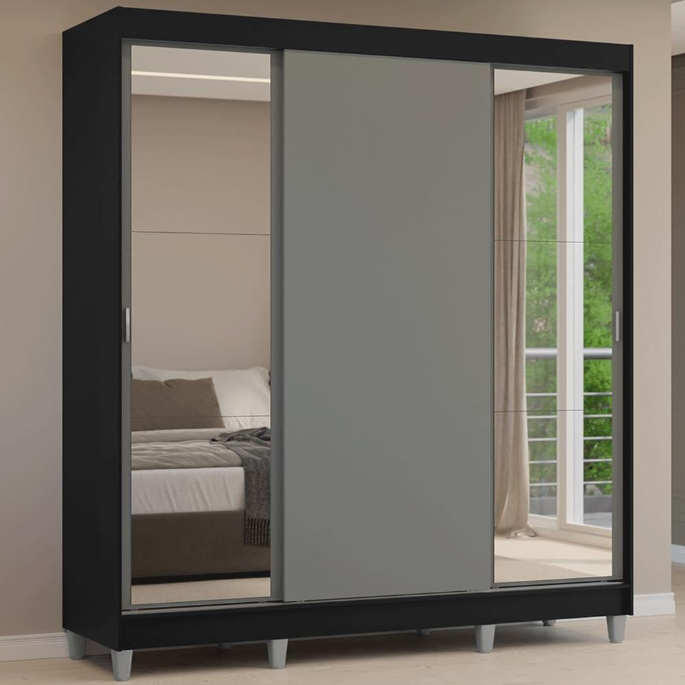 Guarda-roupa Casal Com Pés 3 Portas De Correr Com Espelhos Preto Cinza Reno Madesa