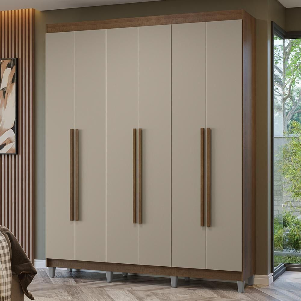 Com acabamento de alta resistência, garantindo durabilidade por muito mais tempo. A estrutura e os puxadores em tom amadeirado Rustic combinam com as portas no tom Crema, criando um visual elegante e moderno. Os puxadores de 80 cm, fabricados em MDF, são um diferencial que destaca o design alongado do móvel. Os pés elevam o guarda-roupa, agregando elegância e facilitando a limpeza do ambiente.