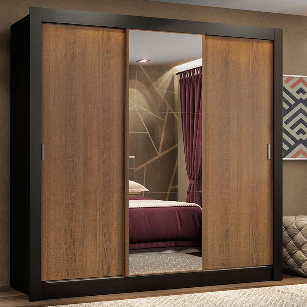 Guarda Roupa Casal Madesa Lyon Plus 3 Portas de Correr com Espelho 4 Gavetas Preto/Rustic