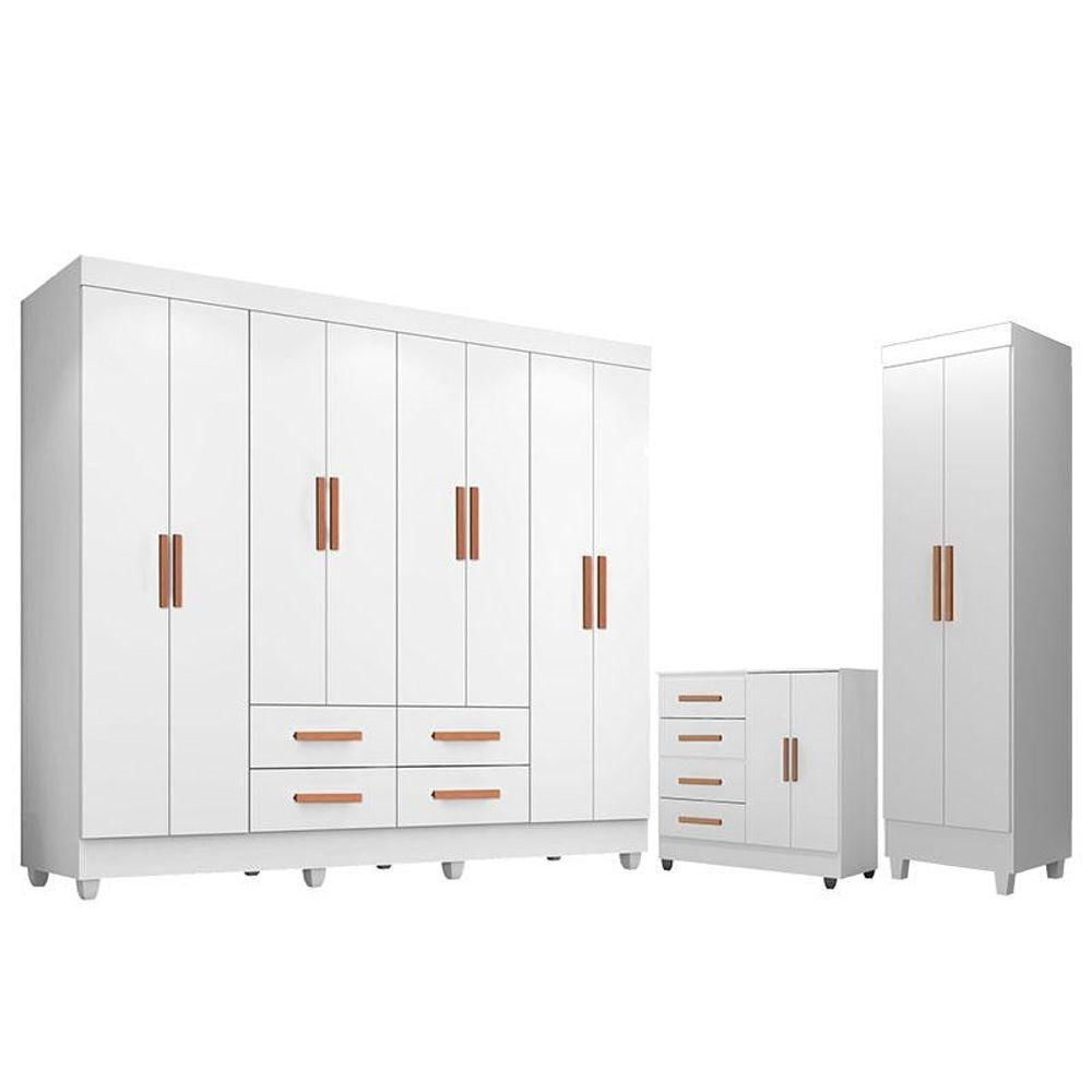 Guarda Roupa Casal Porto 8 Portas Com Cômoda 4 Gavetas 2 Portas E Armário Multiuso Lite Branco Brilho - Leão