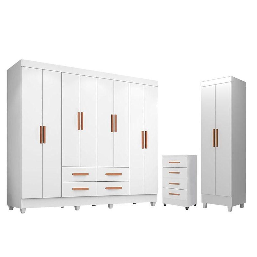 Guarda Roupa Casal Porto 8 Portas Com Cômoda 4 Gavetas E Armário Multiuso Lite Branco Brilho - Leão