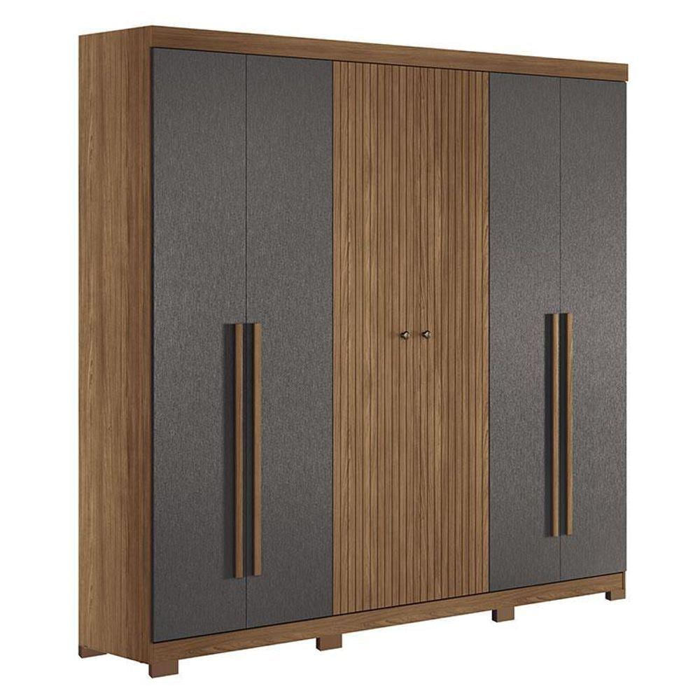 Guarda Roupa Casal Ripado 6 portas Buriti Jatobá Grafite com pés Acetinado - Santos Andirá Guarda Roupa Casal Ripado 6 portas Buriti Jatobá Grafite com pés: Mais espaço, mesmo design elegante: o Ripado Buriti 6 portas oferece prateleiras extras, gavetas e cabideiros que ajudam a manter o quarto sempre arrumado. Versátil e atemporal, é perfeito para famílias que precisam de organização sem abrir mão da aparência. Características técnicas: - Desenvolvida em MDP/MDF - Pintura em Reverse Semi-Fosco - 04 Gavetas com Corrediças Telescópicas - 02 Puxadores em ABS e 04 puxadores em MDF - 03 Amplos maleiros - 07 Prateleiras - 06 Portas com dobradiças metálicas - 03 cabideiros/calceiros em alumínio - Possui pés