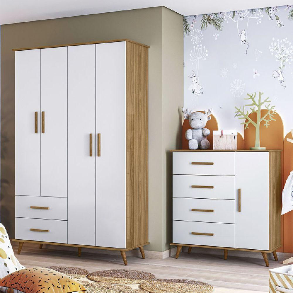 Guarda Roupa Infantil 4 Portas 2 Gavetas E Cômoda 1 Porta 4 Gavetas Noah Retrô Nature Com Branco