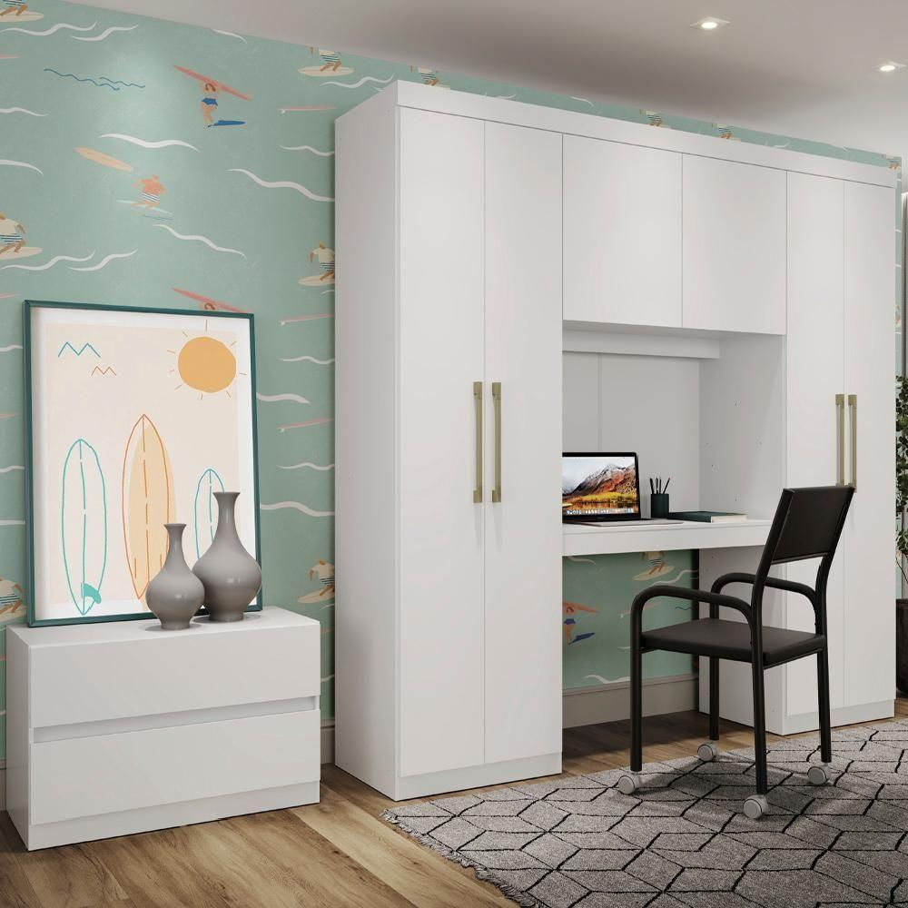 Guarda Roupa Infantil 6 Portas 2 Gavetas Porto Branco Com Escrivaninha Carraro O Roupeiro Porto possui 6 portas de batente e gaveteiro móvel. É um produto chave para diferentes necessidades, já que sua peça central pode ser montada de diversas formas, como: painel de TV, mesa de escrivaninha ou cabeceira de cama de solteiro. Além disso, o gaveteiro solto permite a utilização da peça em vários cantos do ambiente.