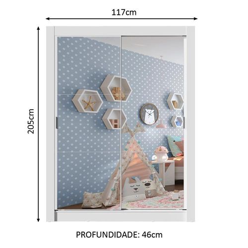 Guarda Roupa Infantil Enzo 2 Portas de Correr Espelho Madesa Para um dormitório mais aconchegante e organizado para as crianças, a aposta é o Guarda-roupa Infantil Enzo da Madesa. São duas portas de correr com deslizamento suave, que facilitam muito no dia a dia, por ocuparem menos espaço. Alguns dos principais diferenciais são: trilhos em alumínio, dobradiças metálicas e ferragens de qualidade que proporcionam melhor sustentação ao móvel.Na parte interna, o espaço é muito bom, com duas prateleiras e três nichos, além de um cabideiro de metal resistente e de tamanho diferenciado, 105 cm. O acabamento da estrutura interna e externa é branco. O processo é feito em Pintura Poliéster de alta resistência, que confere maior qualidade e durabilidade ao produto.Itens inclusos: - Um (1) cabideiro metálico grande - Duas (2) prateleiras e quatro (4) nichos - Duas (2) portas de correr com espelhos e puxadores em PVCEspecificações técnicas: Marca: Madesa Cor: Branco Peso Aproximado: 69 Kg Material: Mdp Dimensões aprox. do Produto: Altura: 205 Cm x Largura: 117 Cm x Profundidade: 46 Cm Garantia: 3 meses