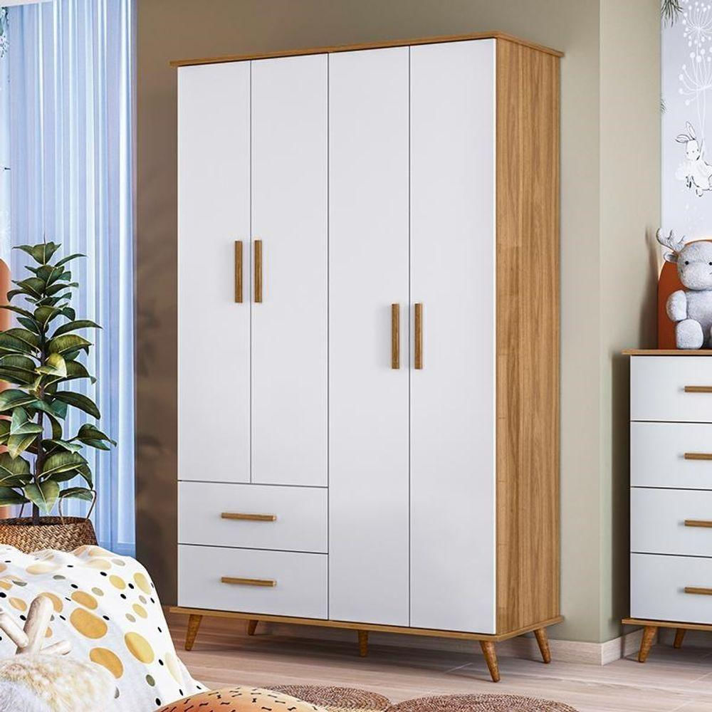 Guarda Roupa Infantil Retrô Noah 4 Portas E 2 Gavetas Para Quarto De Bebê Nature Com Branco