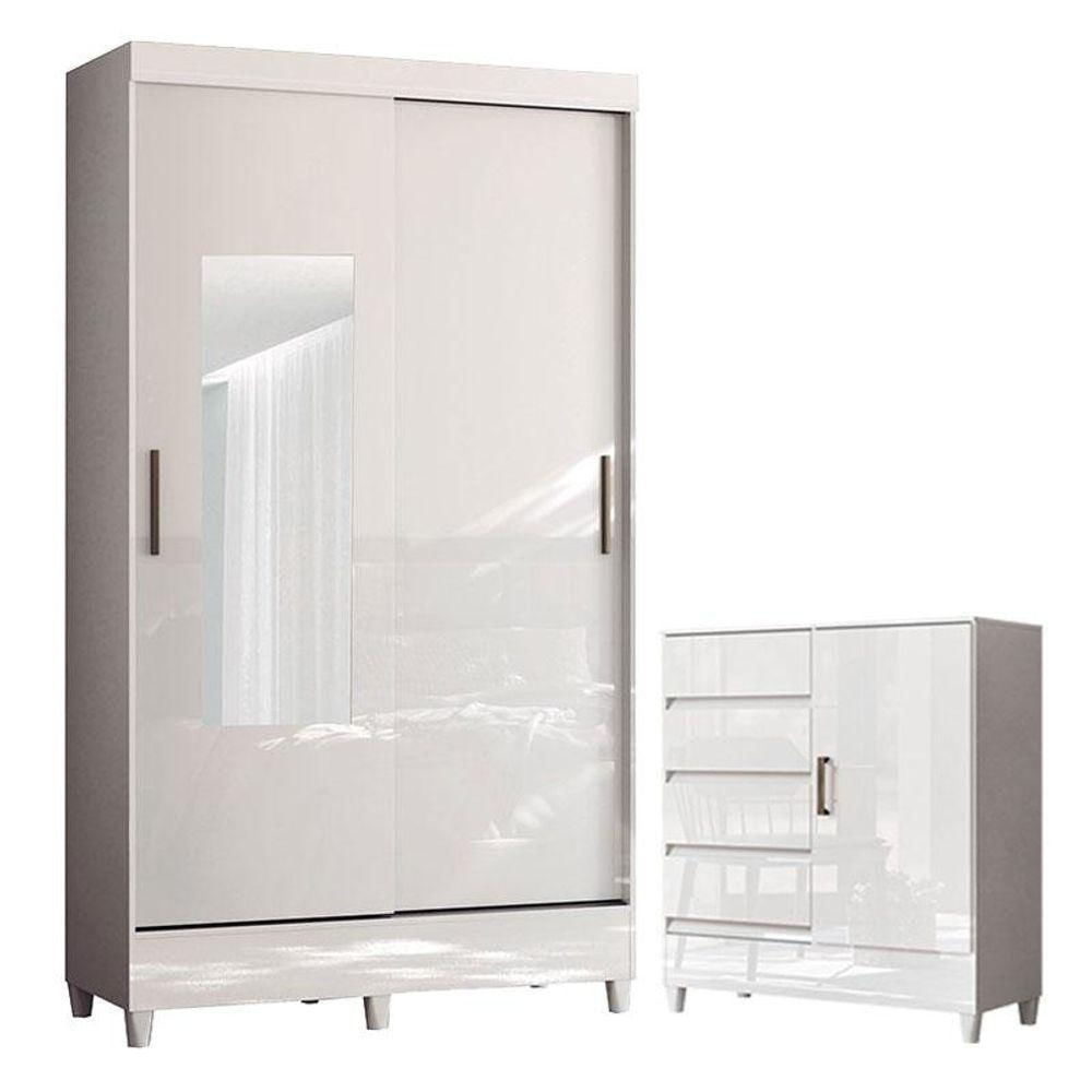 Guarda Roupa Solteiro 2 Portas De Correr E Espelho Fit Com Cômoda 1 Porta E 4 Gavetas Fit Branco Brilho - Santos Andirá