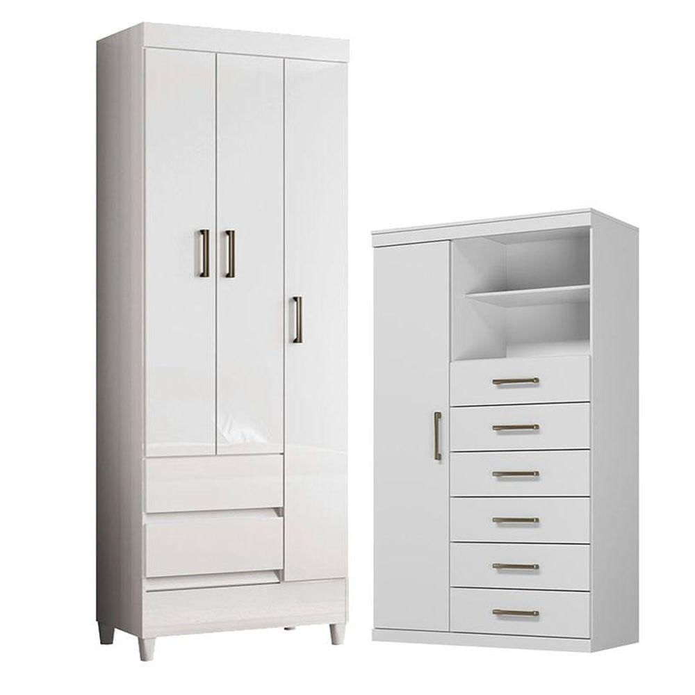 Guarda Roupa Solteiro 3 Portas Com Pés Fit E Cômoda 1 Porta E 6 Gavetas Marabá Branco Brilho-santos Andirá
