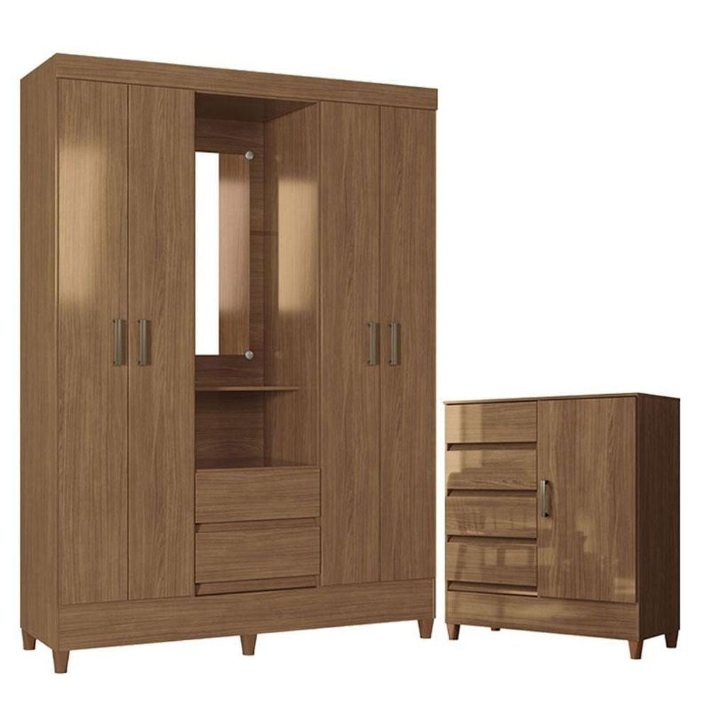 Guarda Roupa Solteiro 4 Portas Com Pés Capelinha Fit Com Cômoda 1 Porta 4 Gavetas Fit Jequitibá Acetinado- Santos Andirá