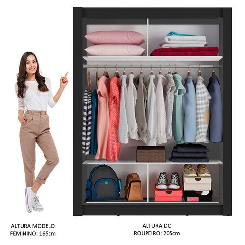 Itens inclusos: - Um (1) cabideiro metálico grande - Duas (2) prateleiras e quatro (4) nichos - Duas (2) portas de correr com puxadores em PVC