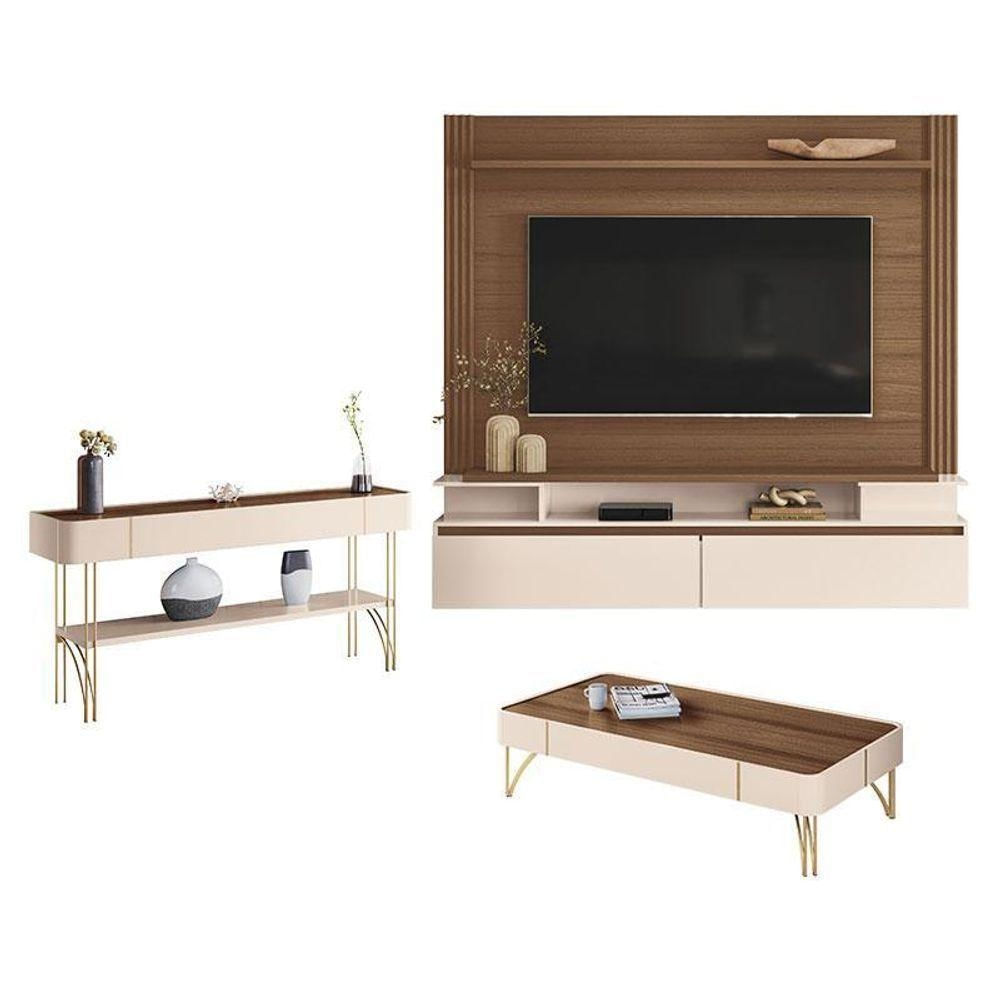 Home Suspenso Astor Castanho Off White com Mesa de Centro Cadenza e Aparador Vivant Off White Castanho - HB MóveisO Home Suspenso Astor com Mesa de Centro Cadenza e Aparador Vivant é ideal para quem busca sofisticação e praticidade na sala de estar. Com design contemporâneo e combinação elegante, o conjunto valoriza o ambiente, oferece melhor aproveitamento do espaço e traz mais organização ao dia a dia.Home Suspenso Astor Castanho Off White - HB MóveisCaracterísticas técnicas: - Projetado para TV de até 65; - 2 Portas basculantes com dobradiças metálicas, - Detalhe canelado vertical nas laterais; - Tampo e prateleira superior com espessura de 25mm; - Produzido em MDP e MDF de 25mm e 15mm;Dimensões: Altura:171cm Largura:181cm Profundidade:33cmMesa de Centro Cadenza Off White Castanho - HB Móveis Características Técnicas: - Desenvolvido em MDP e MDF - Cantos arredondados - Laterais com filetes decorativos - Pés em aço maciço 3/8 com acabamento dourado - Design moderno