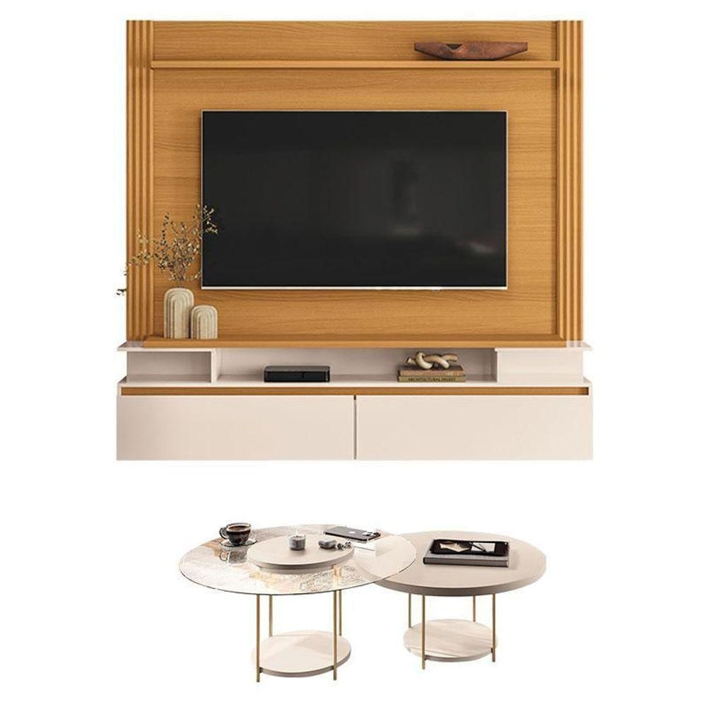 Home Suspenso Astor Cinamomo Off White com Kit Mesa de Centro Sky Off White - HB MóveisO Home Suspenso Astor com Kit Mesa de Centro Sky é ideal para quem busca sofisticação e praticidade na sala de estar. Com design contemporâneo e combinação elegante, o conjunto valoriza o ambiente, oferece melhor aproveitamento do espaço e traz mais organização ao dia a dia.Home Suspenso Astor Cinamomo Off White - HB Móveis Características técnicas: - Projetado para TV de até 65; - 2 Portas basculantes com dobradiças metálicas, - Detalhe canelado vertical nas laterais; - Tampo e prateleira superior com espessura de 25mm; - Produzido em MDP e MDF de 25mm e 15mm;Dimensões: Altura:171cm Largura:181cm Profundidade:33cmMesa de Centro Sky com Tampo de Vidro Off White – HB MóveisCaracterísticas Técnicas: - Tampo de vidro 6mm - MDF 15 mm - Pés em aço maciço 3/8 com acabamento em tom dourado - Tampo em mdf - Lindo design