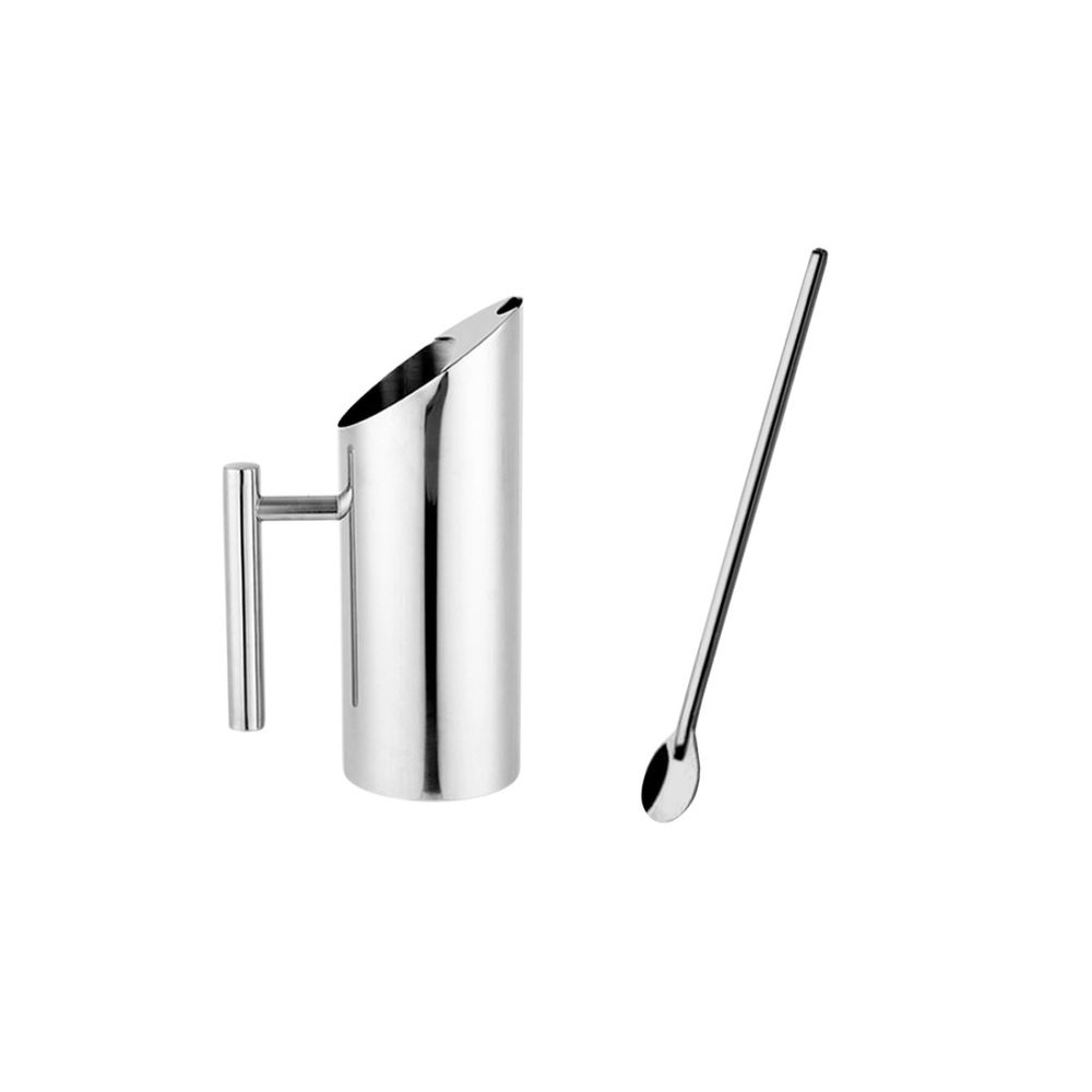 Jarra de suco e agua e colher bailarina em aço inox. A jarra possui bico inclinado com aparador de gelo facilitando na hora de servir. O recipiente foi produzido em aço inox, resistente a impactos, possui maior resistencia a trincas e rupturas, mesmo em contato com altas e baixas temperaturas. A jarra alem de um designer sofisticado é confortavel de segurar, sendo perfeita para servir em bares, restaurantes, festas e buffet. A colher Bailarina é muito requisitada no bar junto com a coqueteleira e o dosador, para o preparo de drinks em copos estreitos e com muito gelo.