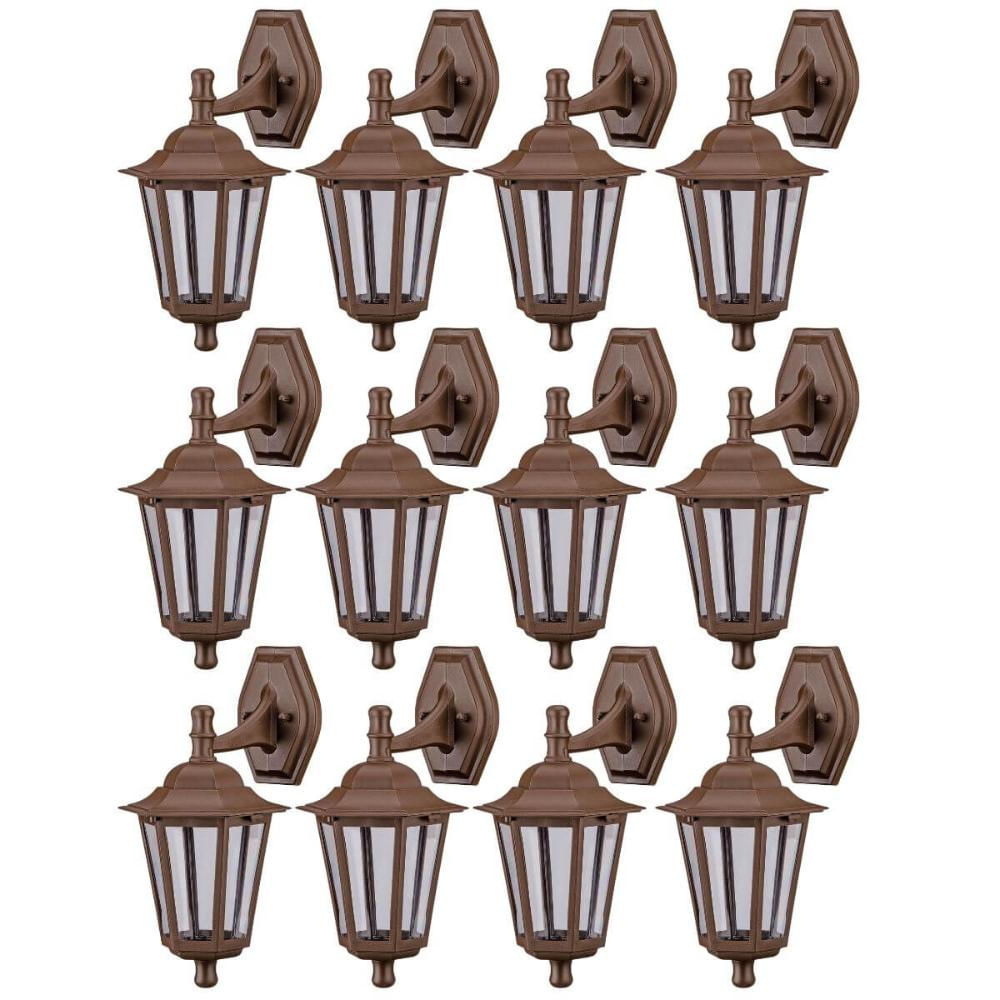 Garantia: 90 dias / Peso total: 8,880kg / Cor predominante: marrom / Referência: 7898505471431; Dimensões de cada: 24cm (C) x 24cm (L) x 37cm (A); Capacidade de cada: 1 lâmpada; Potência máxima da lâmpada: até 20W; Conteúdo: 12 arandelas de parede; Uso: interno ou externo; Voltagem: bivolt; Rosca: E27; Materiais: polipropileno e termoplástico transparente; Obs.: não usar lâmpada incandescente. Não acompanha lâmpada.