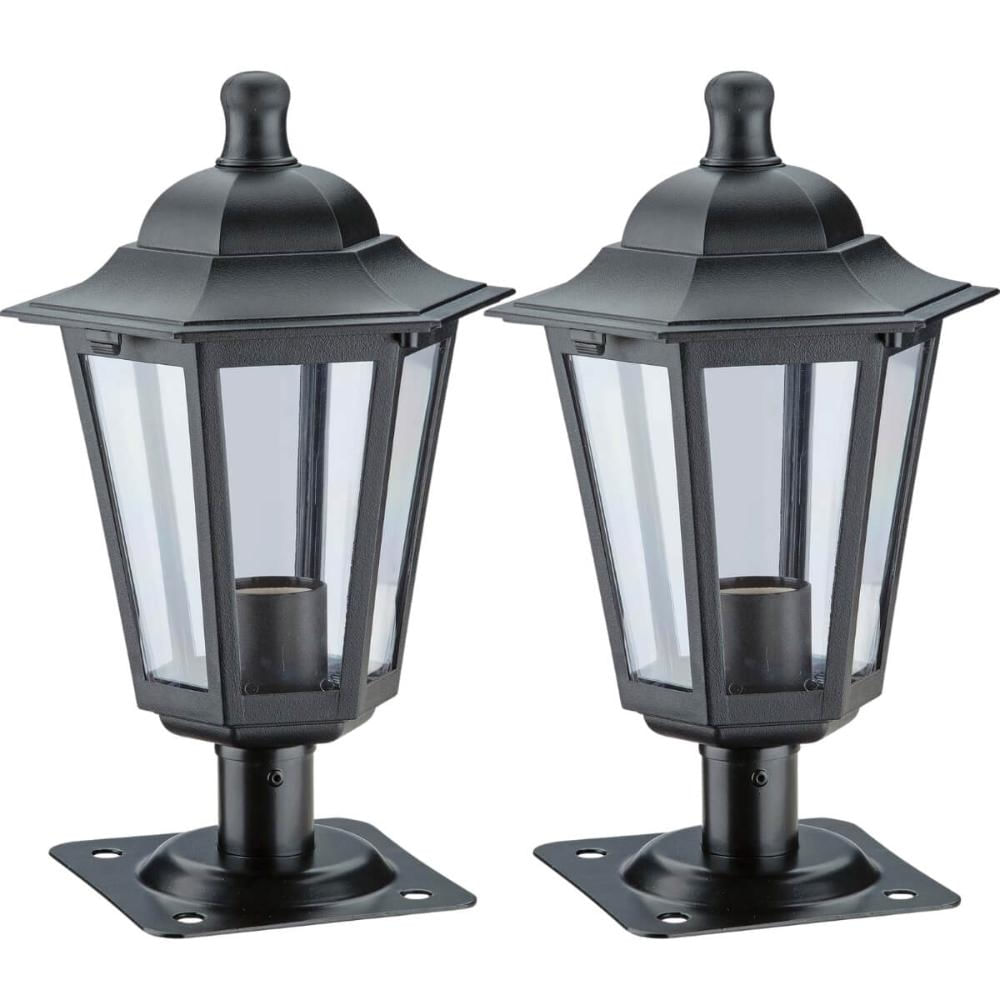 Garantia: 90 Dias / Peso de cada: 450g / Cor: preto / Ref: 7794465665999; Dimensões de cada: 18cm (C) x 18cm (L) x 31cm (A); Soquete: E27, não acompanha lâmpada; Voltagem: bivolt; Potência: até 20W; Materiais: polipropileno (PP) e alumínio; Modelo: linha Grega; Conteúdo: 2 postes balizadores.