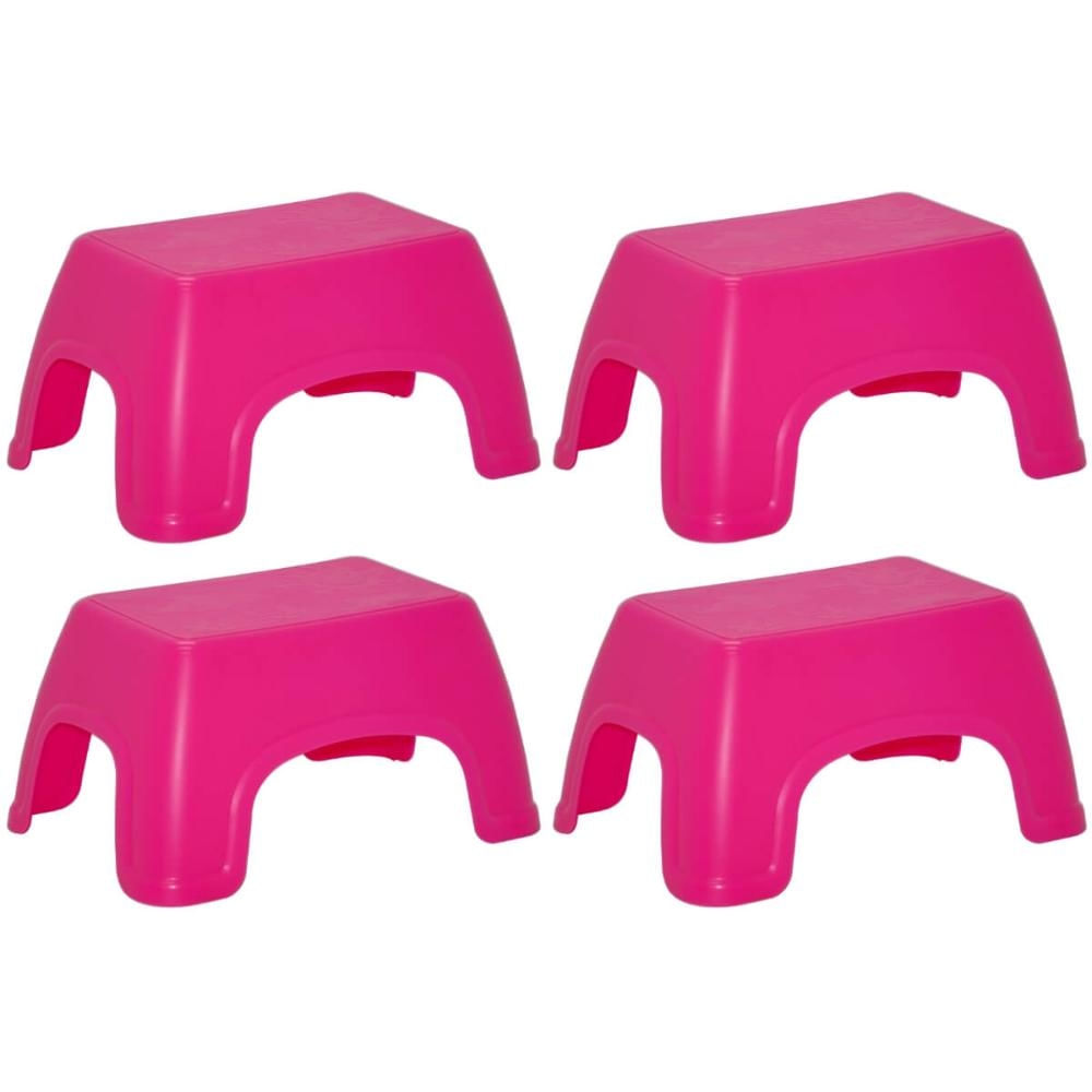 Garantia: 90 dias / Peso de cada: 660g / Cor: rosa / Ref: 7794465606671; Dimensões de cada: 25cm (C) x 35,5cm (L) x 18,5cm (A); Faixa etária recomendável: +2 anos; Peso máximo suportado: 80kg cada; Materiais: plástico injetado; Conteúdo: 4 banquinhos infantis.