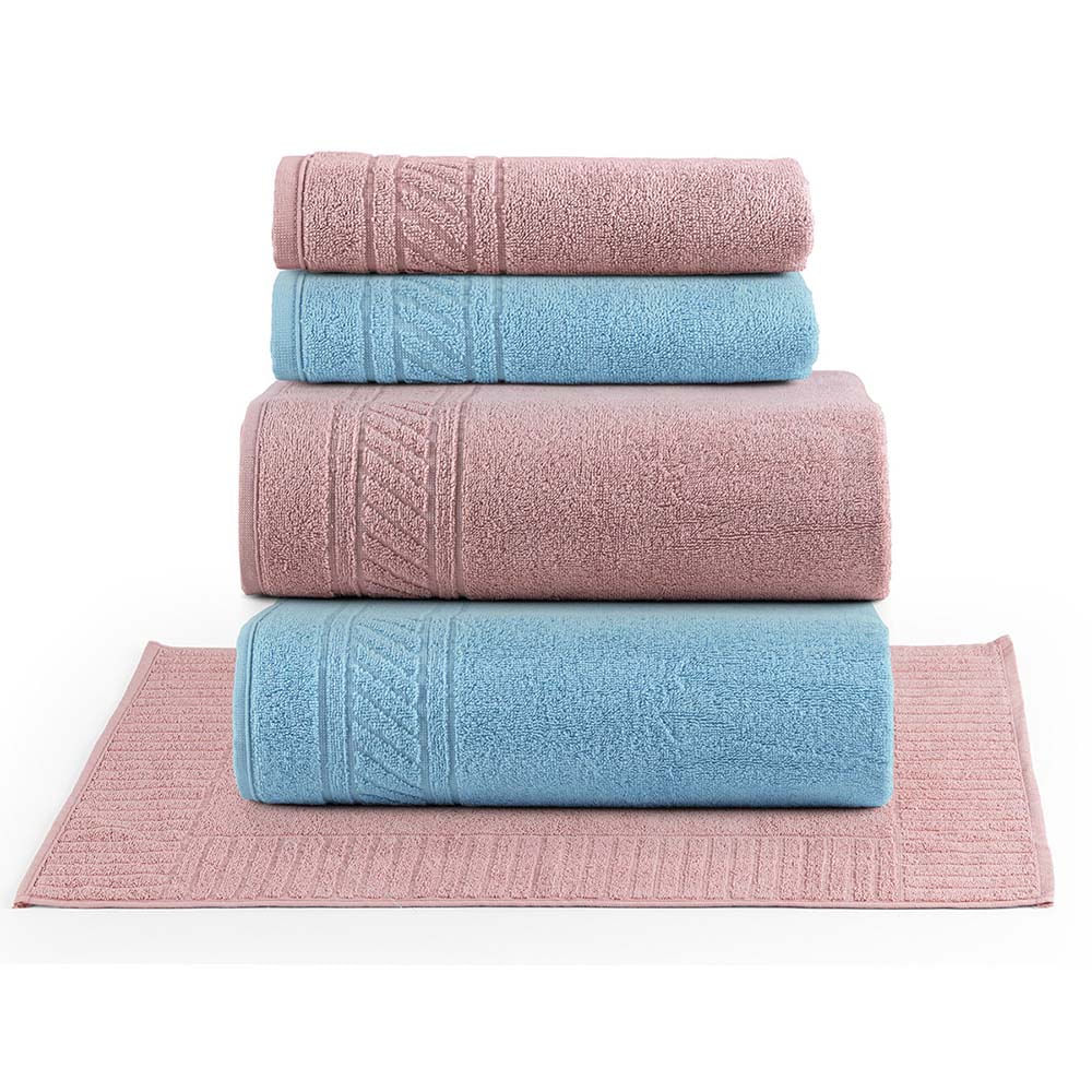 Jogo de Banho Toalhas Yara 100% Algodão Fio Penteado Macio 05 Peças Listras - Rosa Azul