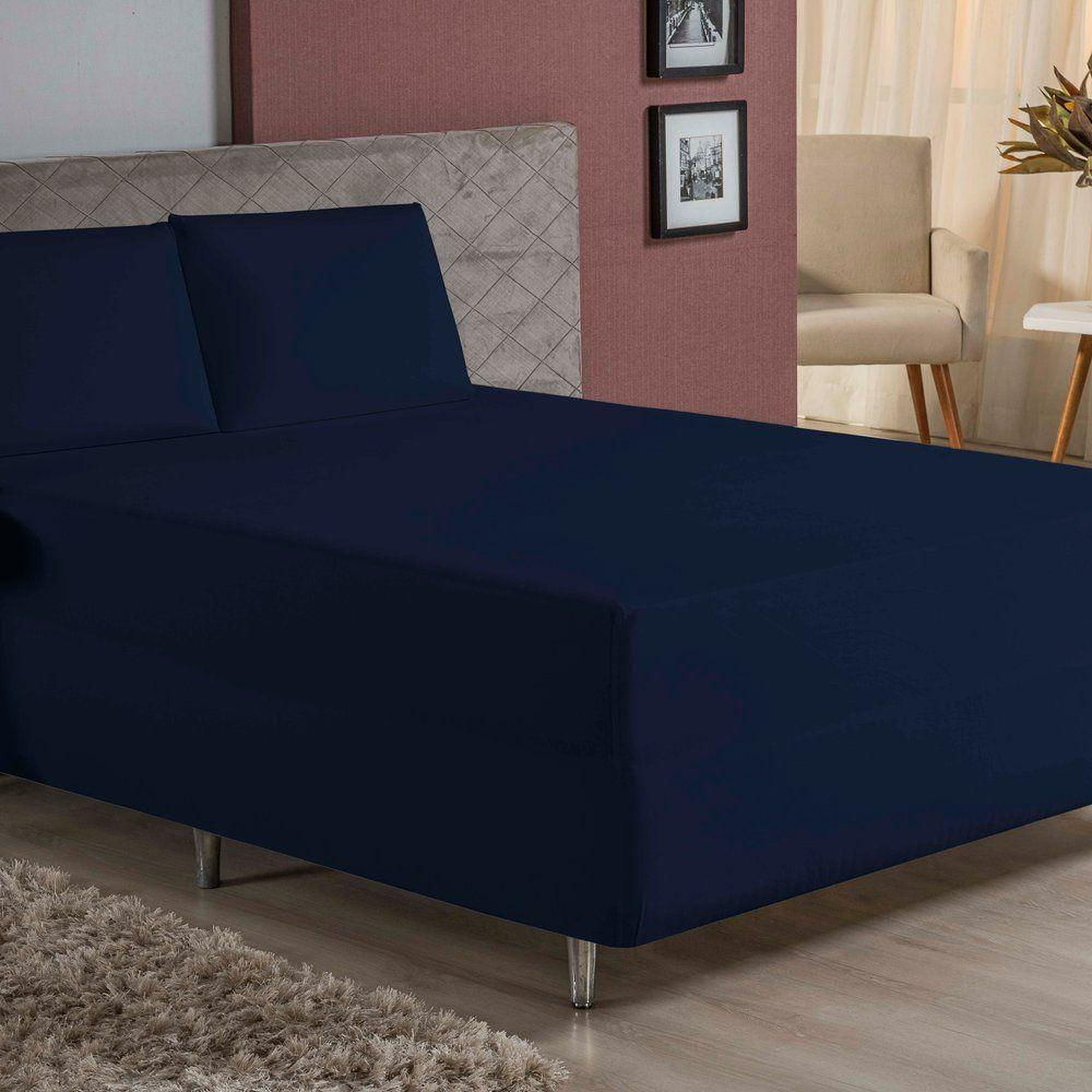 Jogo De Cama Casal Nobre 3 Peças Luva De Box 55cm De Altura Malha 100% Algodão - Azul-marinho