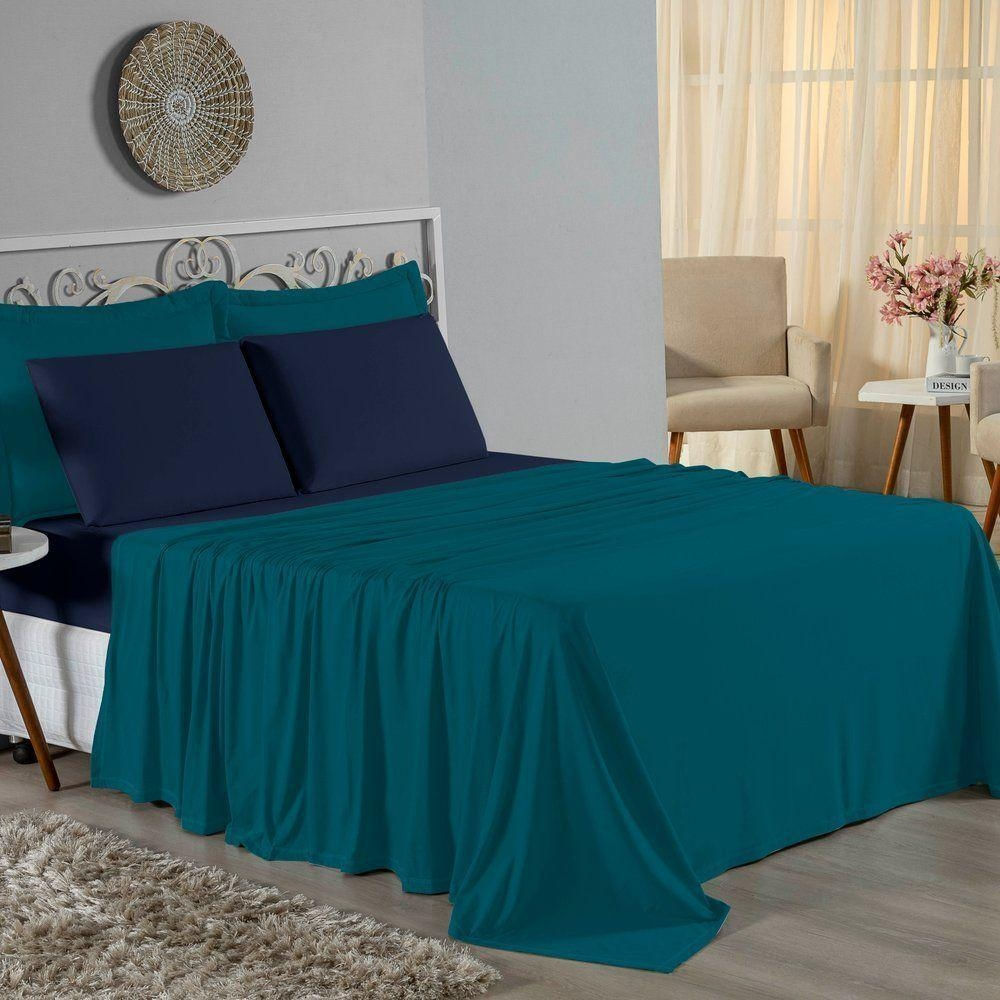 Jogo De Cama Casal Nobre 4 Peças Lençol Com Elástico De 30cm De Altura Malha 100% Algodão - Petróleo / Azul-marinho