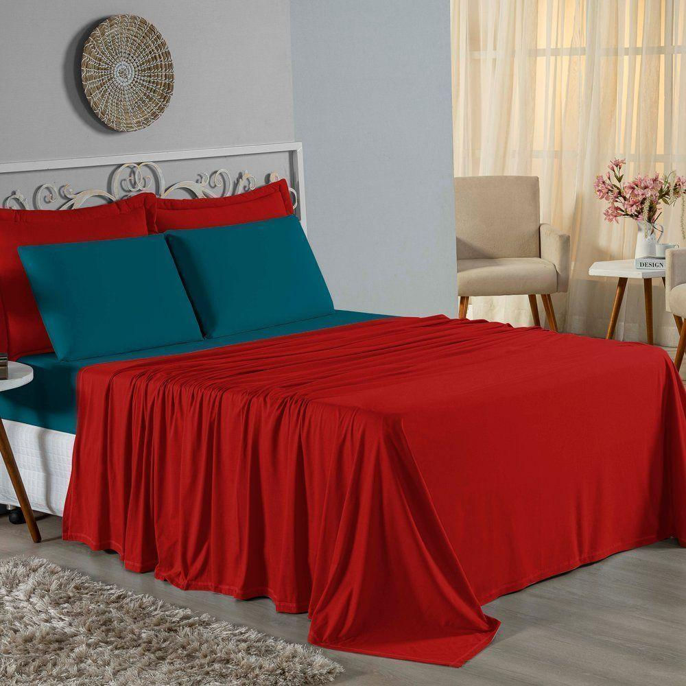 Jogo De Cama King Nobre 4 Peças Lençol Com Elástico De 30cm De Altura Malha 100% Algodão - Vermelho / Petróleo