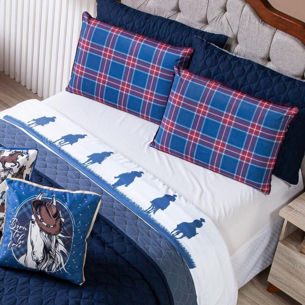 Jogo De Cama Lençol Casal Padrão Country Com Fronhas Estampadas 04 Peças - Tecido Percal 200 Fios Cor Azul