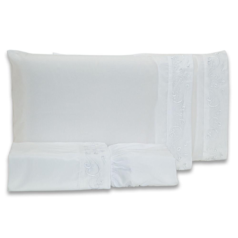 Jogo De Cama Lençol King Blossom Bordado Floral Percal 300 Fios Com Fronhas 04 Peças - Toque Acetinado Cor Branco