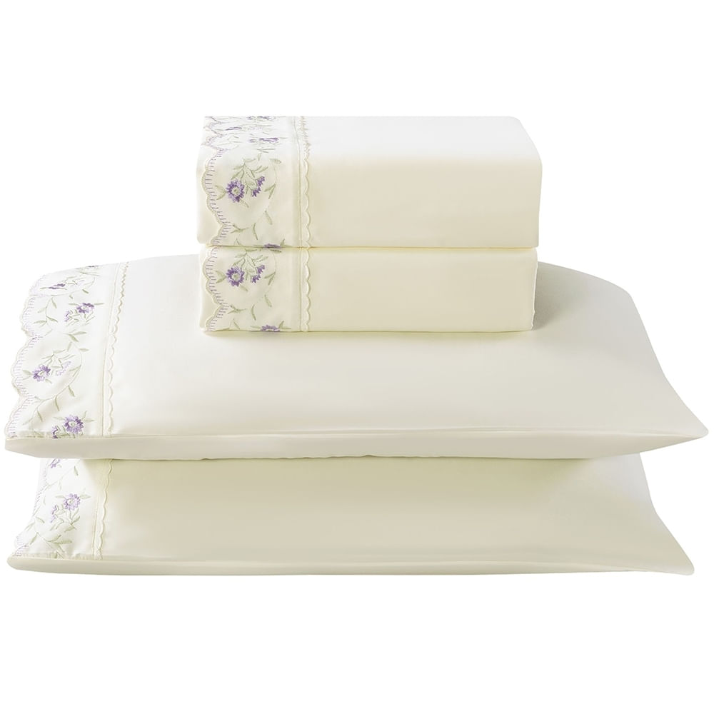 Jogo de Cama Lençol King Bordado Acalanto 4 Peças - Palha C - 100% Poliéster