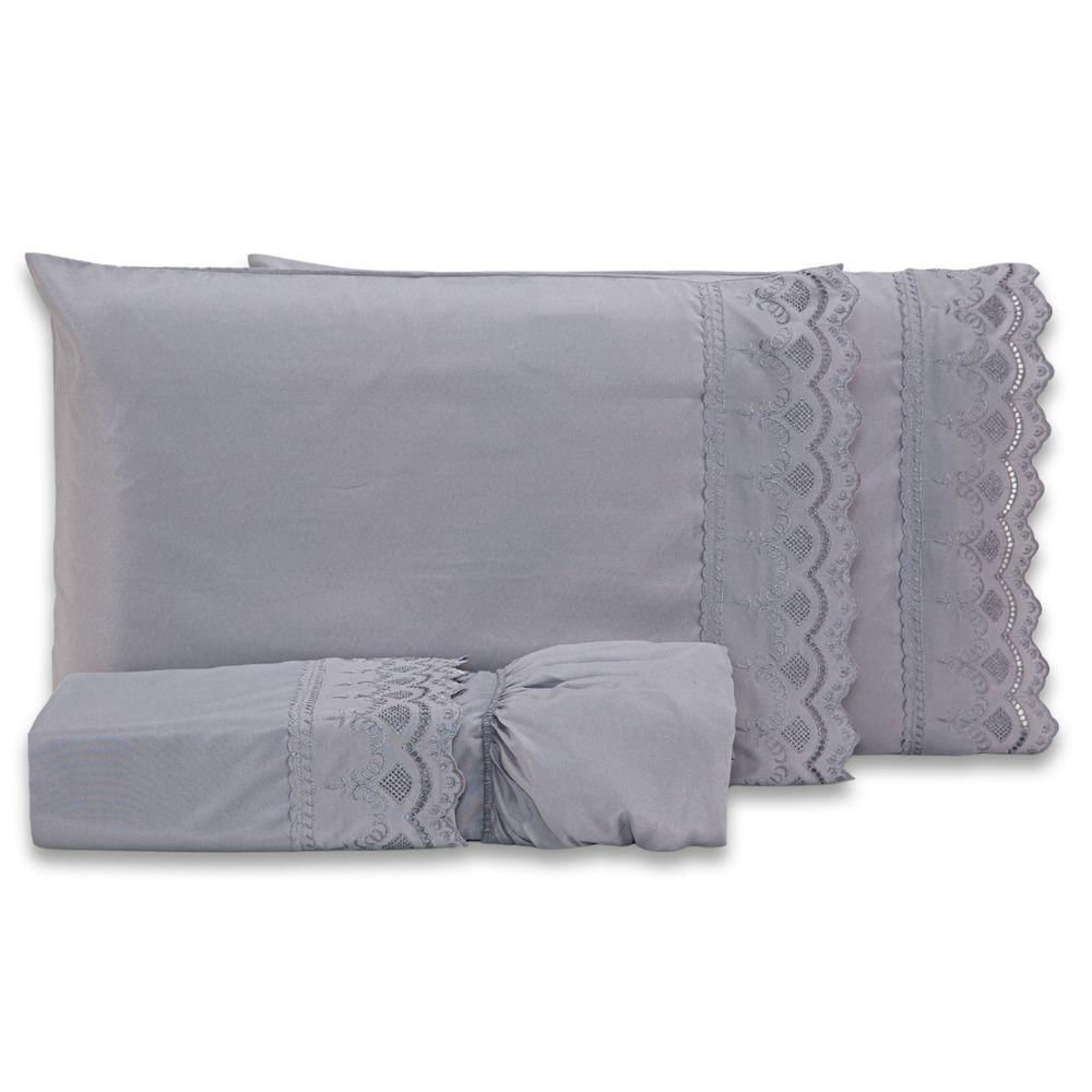 Jogo De Cama Lençol King Sublime Bordado Inglês Percal 300 Fios Com Fronhas 04 Peças - Toque Acetinado Cor Cinza