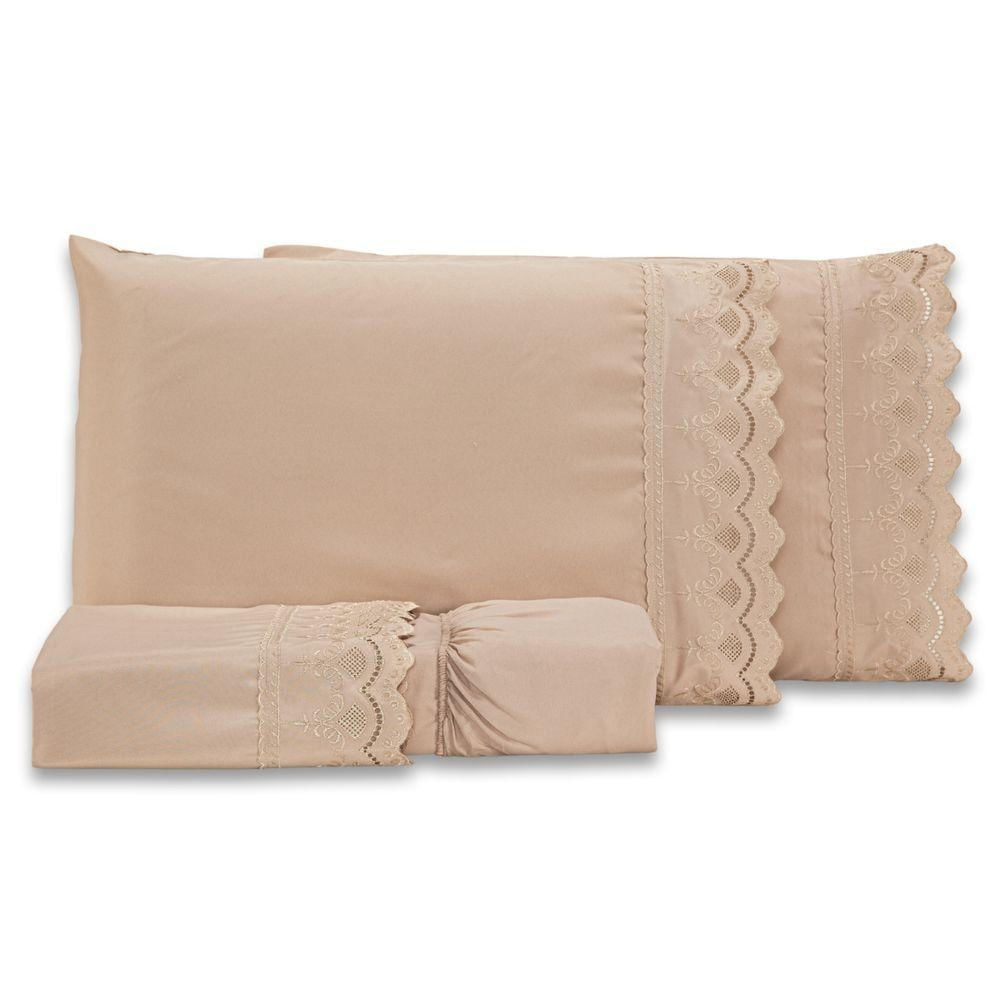 Jogo De Cama Lençol Queen Sublime Bordado Inglês Percal 300 Fios Com Fronhas 04 Peças - Toque Acetinado Cor Caqui